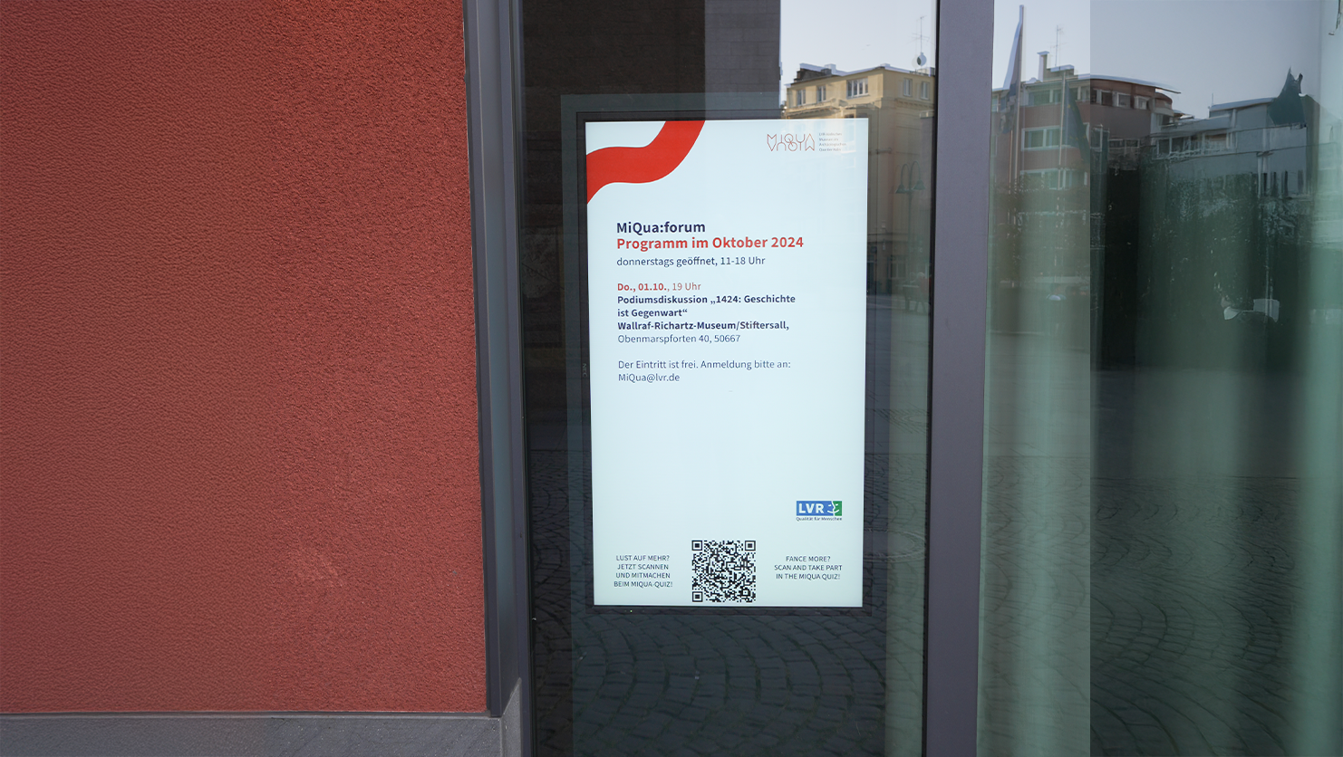 Für das MiQua Forum wurde ein interaktiver Screen entwickelt, der vom ZMB komplett umgesetzt wurde – von der Konzeption bis zur Programmierung. Auf dem Screen kann ein selbst steuerbares Quiz gespielt werden, dessen Antwortvideos und Audios zusätzlich auf der Website abrufbar sind. Außerdem werden aktuelle Veranstaltungen im MiQua direkt auf dem Screen angezeigt.